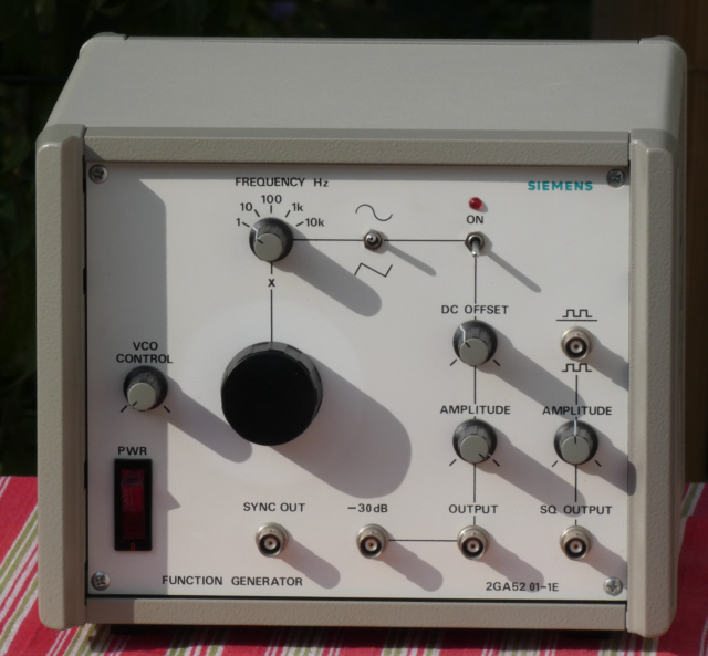 Ein Siemens Funktionsgenerator in einem super stabilen Stahlgehäuse, das wohl einmal als Abschlussarbeit angefertigt worden ist. Ich habe es praktikabel gemacht und ein 10 Gang- Spindelpotentiometer für die Frequenzeinstellung eingebaut. Ideal für Lehrzwecke und Audiobastler. Preis 100 Euro |