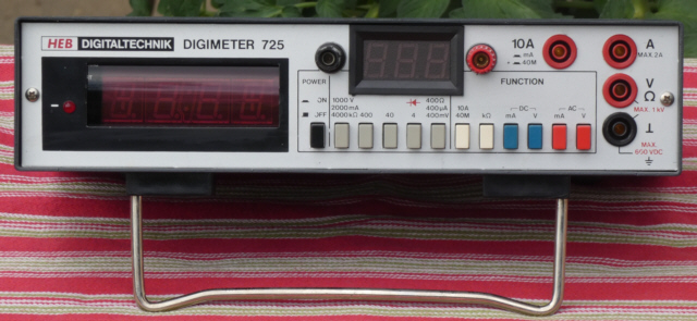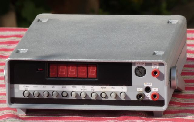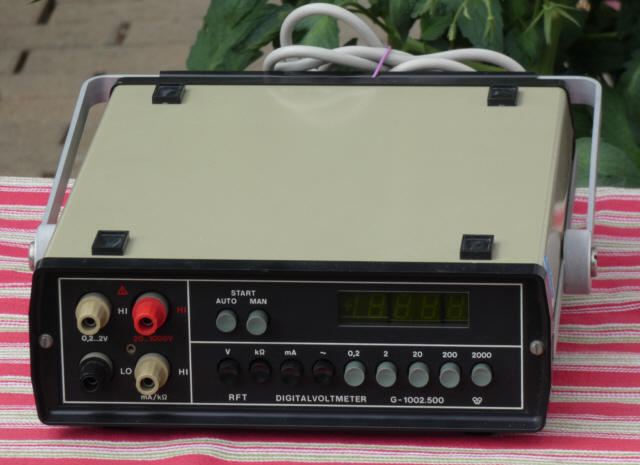 Eines der ersten Digitalen Voltmeter mit Digitronanzeigen aus dem Jahr 1974. Das Gerät ist sehr zuverlässig und genau. Die Verarbeitung ist einzigartig und an vergoldeten Bauteilen wurde nicht gespart. 5 1/2 Digits werden tatsächlich gemessen und die letzte Stelle zappelt nicht so herum, wie bei diversen anderen späteren Multimetern. Die Samplingrate ist regelbar.