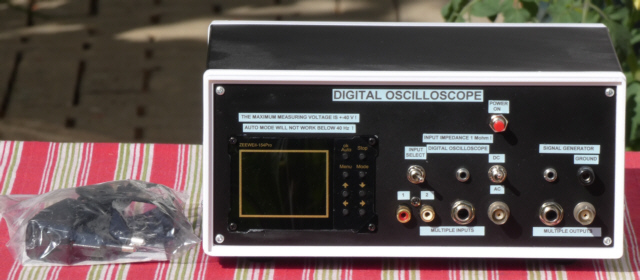 Ein kleiner Digitaloszi mit Funktionsgenerator, den ich hier in ein Metallgehäuse eingebaut habe und mit diversen Buchsen für Audio und Musiksynthesizer- Module versehen habe. Der originale Bausatz aus China war ohne den notwendigen Accu geliefert worden, so dass ich ein Steckernetzteil angeschlossen habe. Immerhin geht die Zeibasis bis 50 ns. Preis auf Anfrage |
