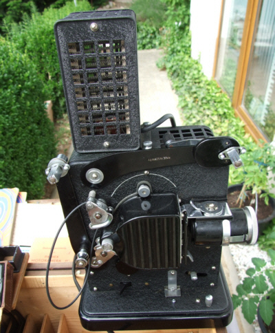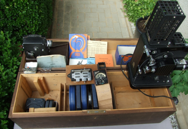 "komplette 9,5 mm Filmausrüstung aus dem Jahr 1939, liebevoll restauriert und funktionsfähig"